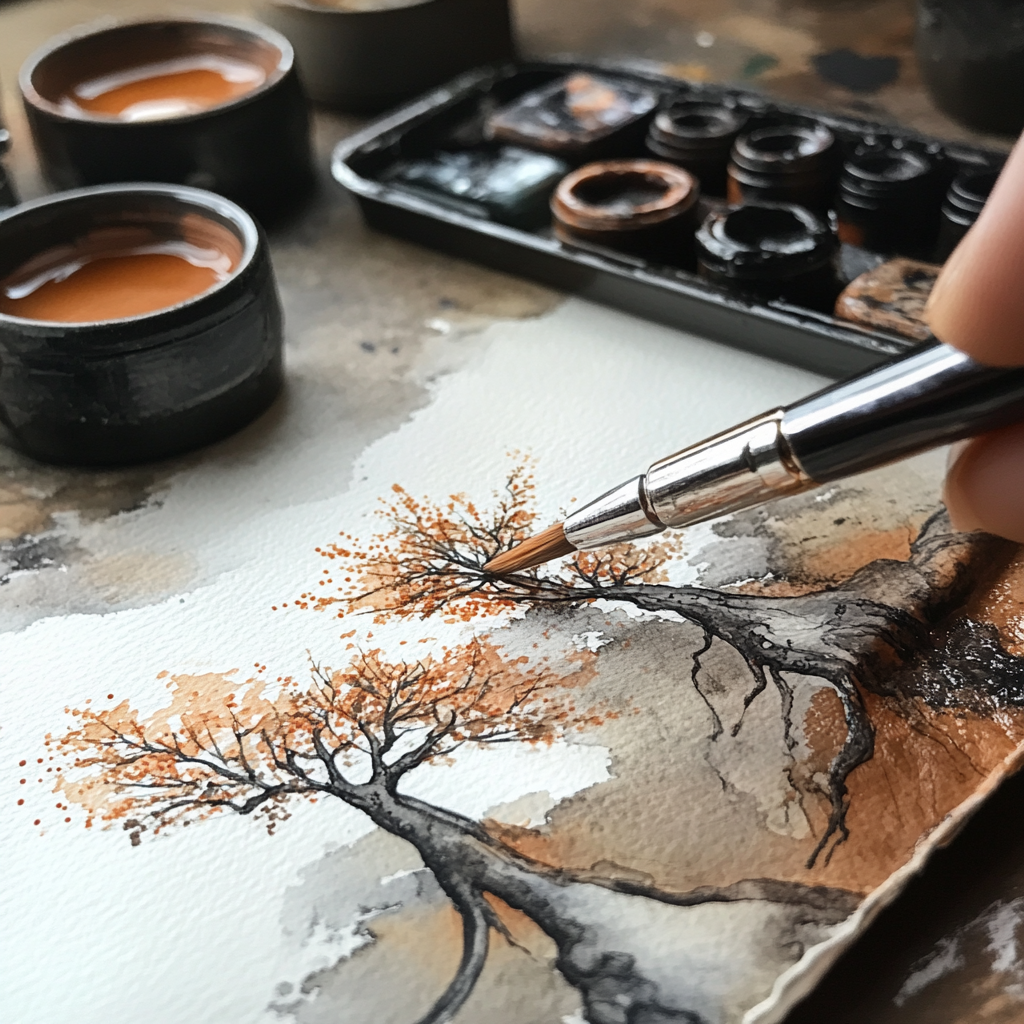 🎨 Ink and Line Art – Intricate detailing with fine lines capturing the raw texture of bark and leaves.